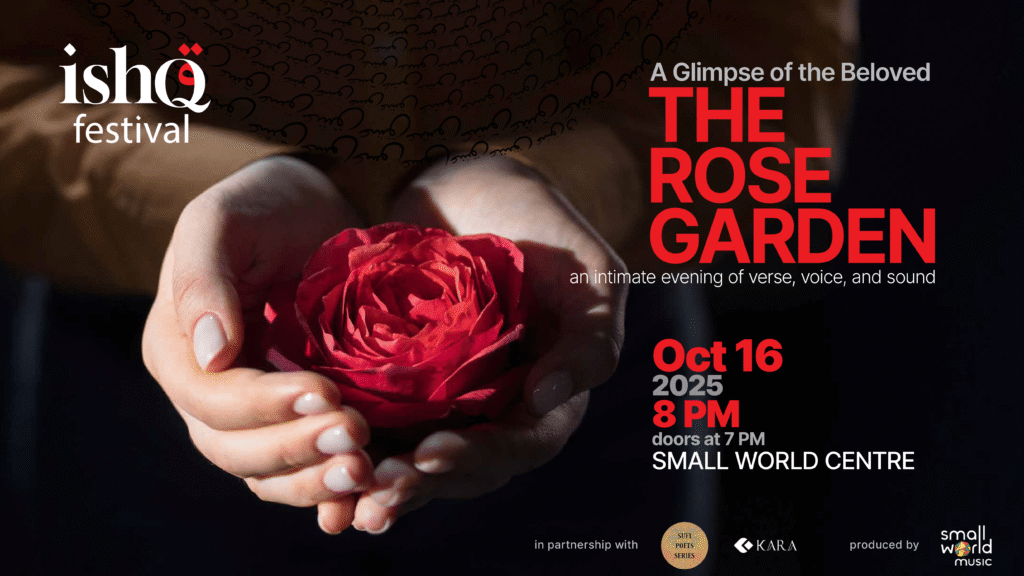 As part of ISHQ Festival’s exploration into language and culture, the Sufi Poet Series summons you to an evening of poetry, storytelling and music. Sip on rose cardamom tea as seasoned storyteller Ariel Balevi captivates with classic, familiar tales like the Nightingale and the Rose. Listen to accomplished musicians Mehdi Rostami & Neda Mohammadpour as they extol the virtues of the rose through enchanting vocals and instrumentals. Sit with arts educator and poet, Sheniz Janmohamed, as she drops petals of poetry from the page to your heart.